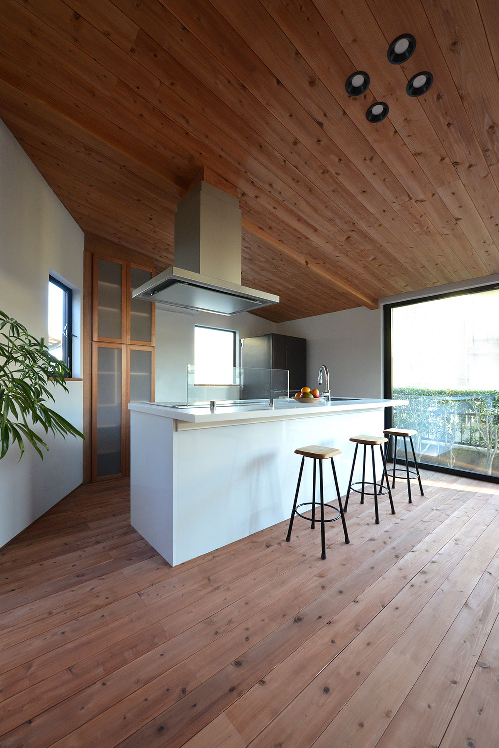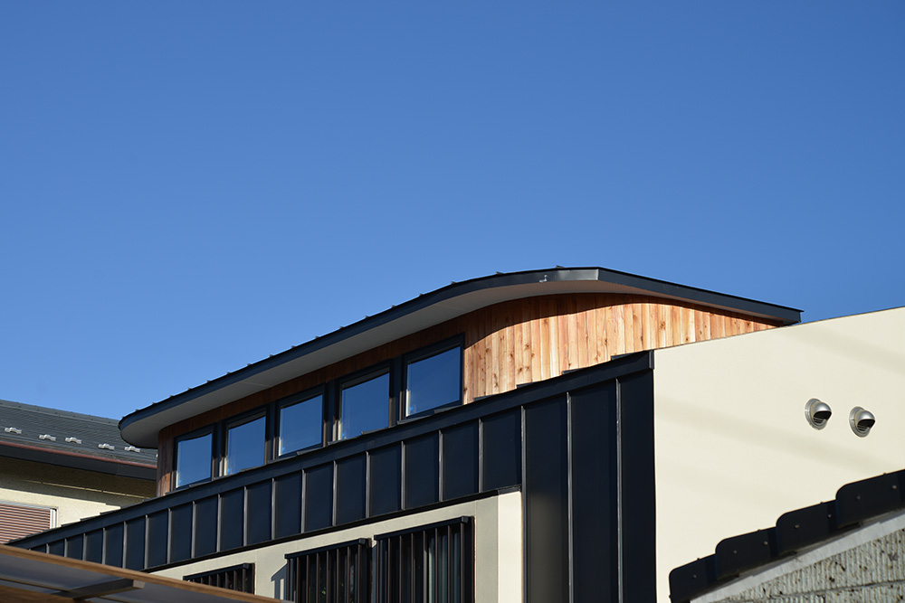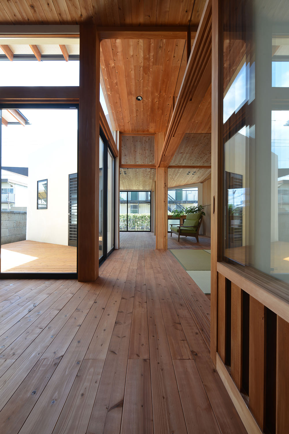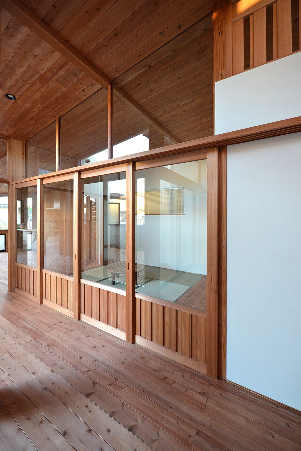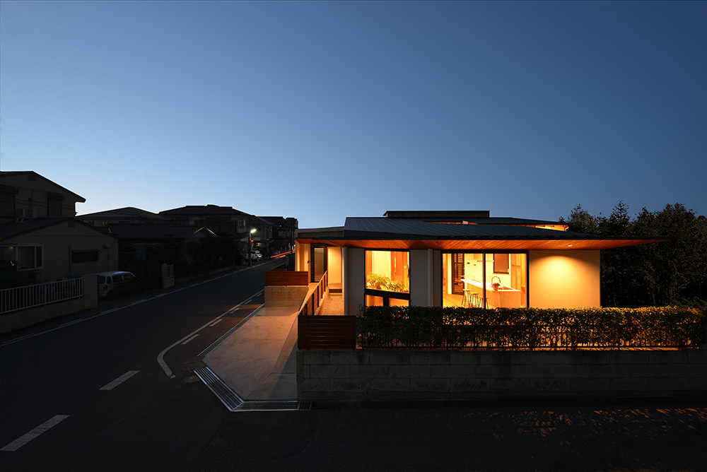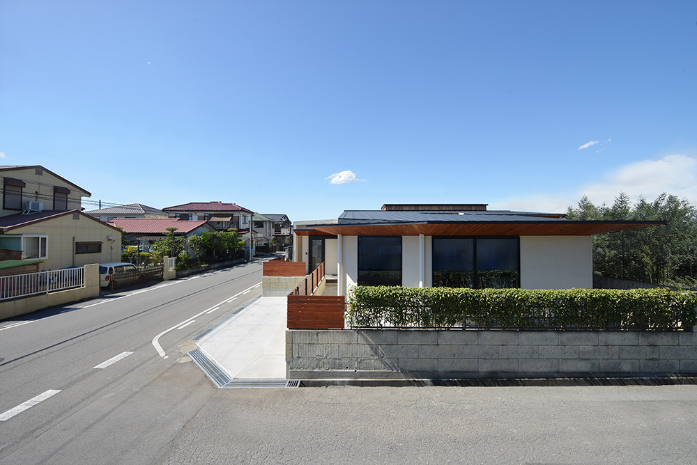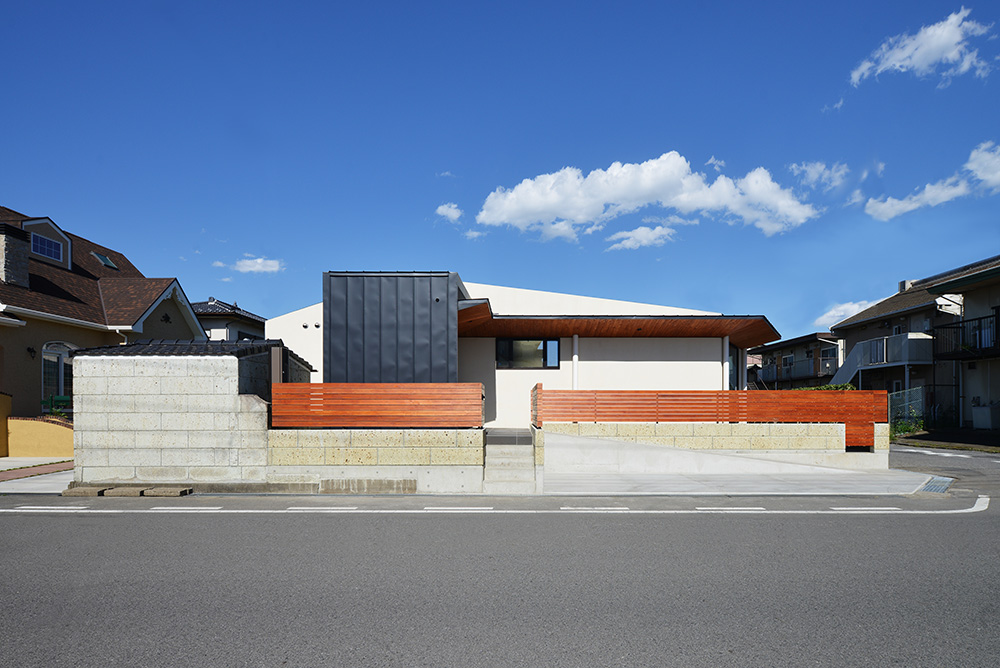 南北に⻑い敷地に平家の建物を計画するにあたり、 家全体に通風・採光を確保すべく建物の中心に光庭(通風採光の為の中庭)を設けました。 光庭を設けることで外部からは閉鎖的な作りとする事ができ プライバシーを確保しながら、よりシンプルな形状のファサードに出来ます。 また、各部屋を光庭に面して計画する事で外部からの視線は遮りつつ風を感じ 太陽の陽射しを取り込むことができます。 内部空間は無垢材の木目が綺麗な板張りの勾配天井にする事により高さのメリハリを付け 空気の流れも計画し易くなり、意匠的にも機能的にも良い居住空間が出来ました。 施工会社 : 野澤住建 |
