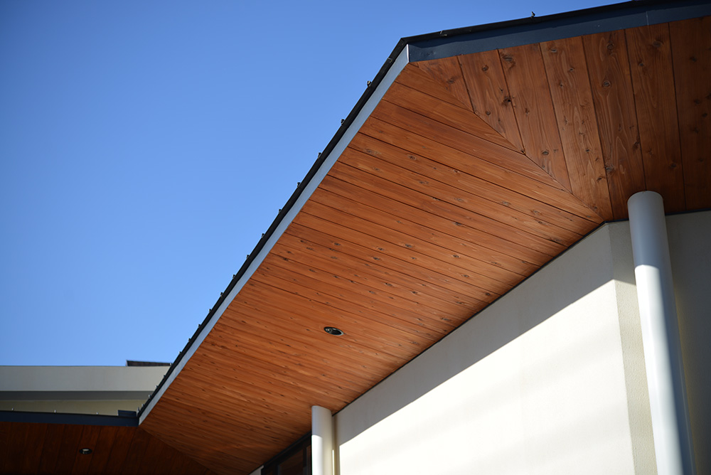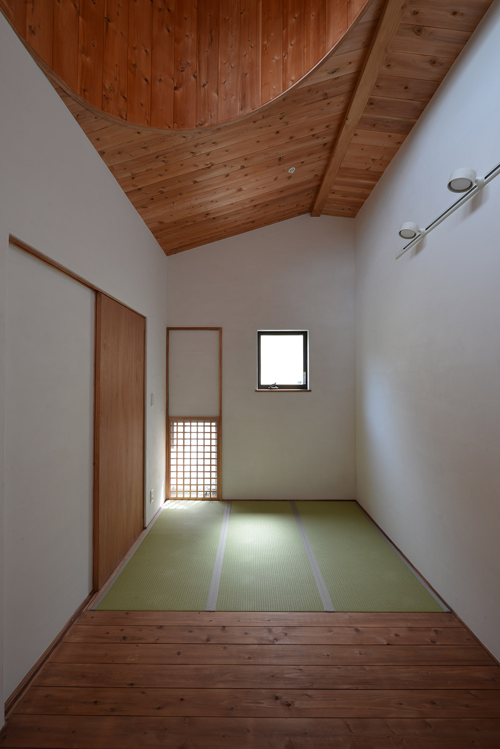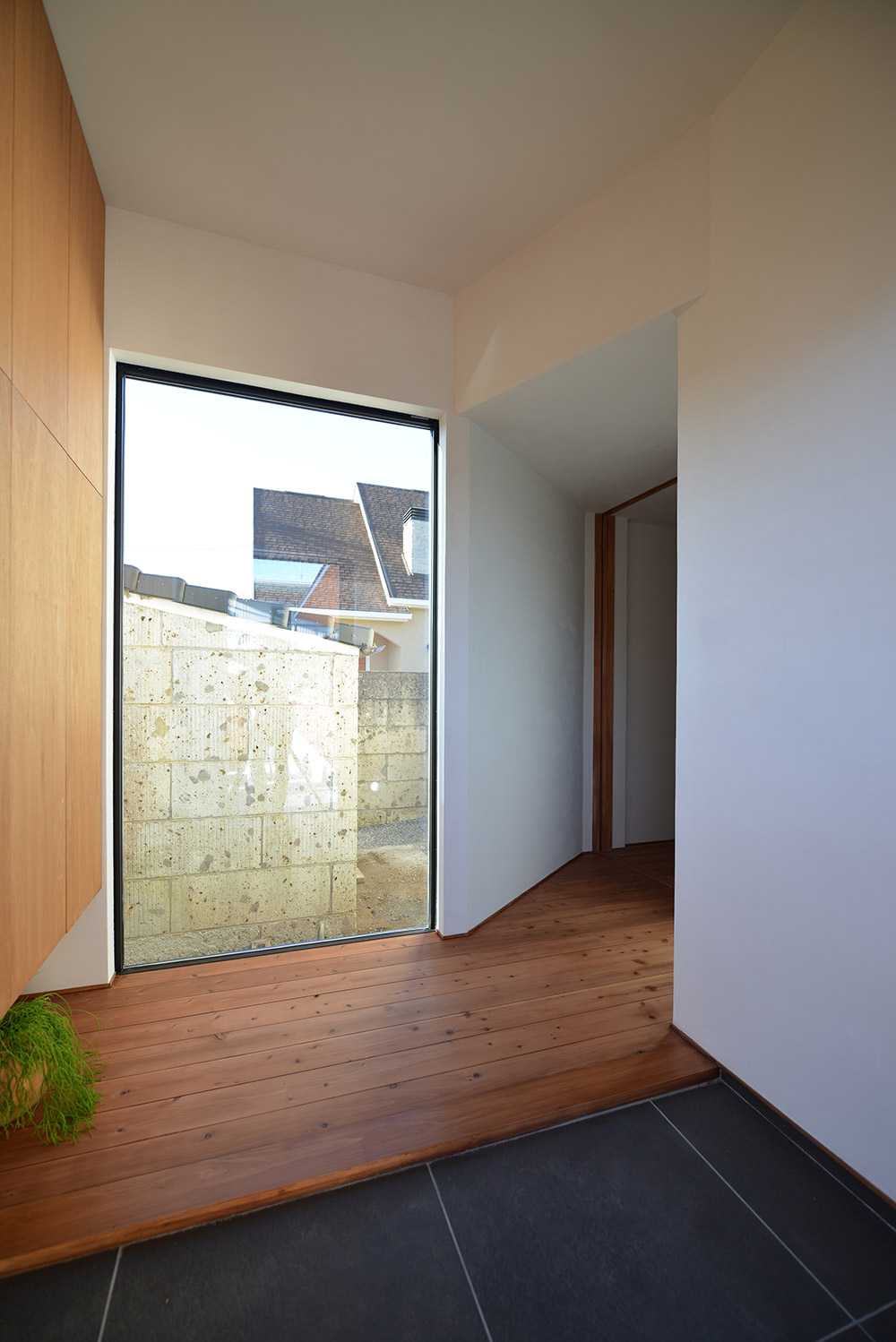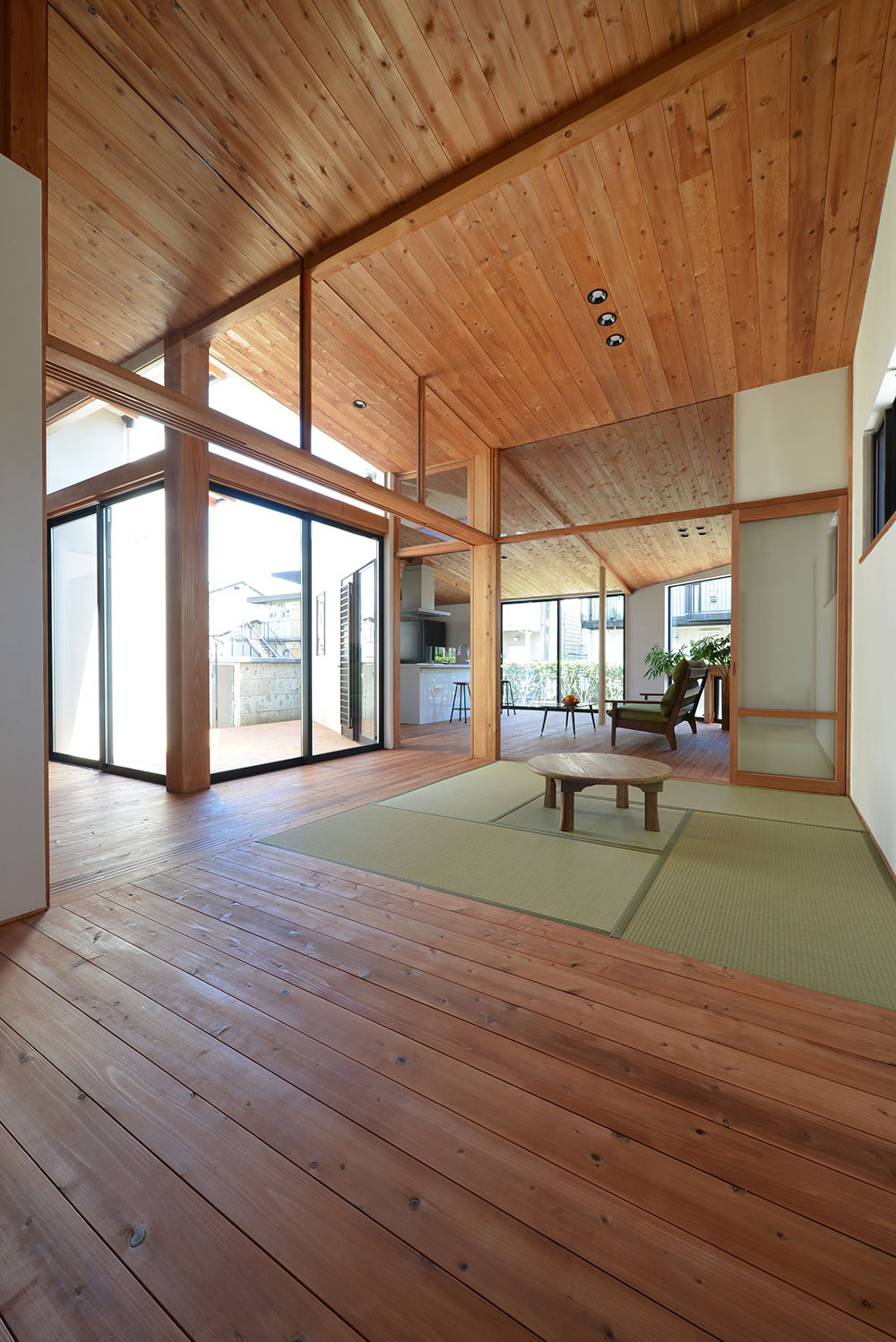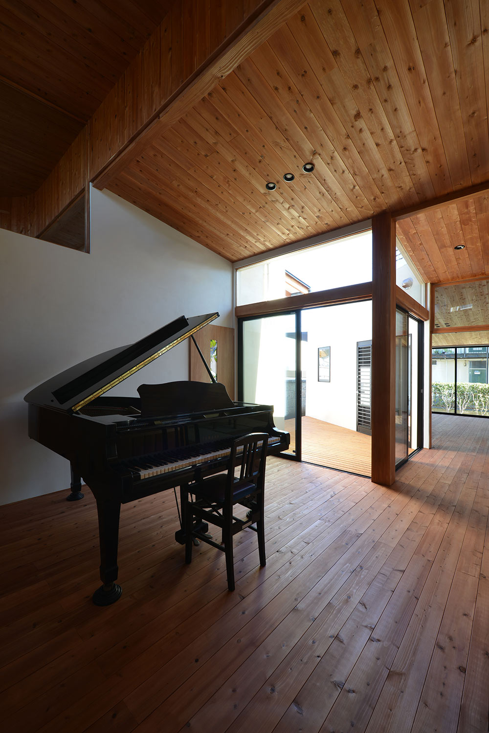 南北に⻑い敷地に平家の建物を計画するにあたり、 家全体に通風・採光を確保すべく建物の中心に光庭(通風採光の為の中庭)を設けました。 光庭を設けることで外部からは閉鎖的な作りとする事ができ プライバシーを確保しながら、よりシンプルな形状のファサードに出来ます。 また、各部屋を光庭に面して計画する事で外部からの視線は遮りつつ風を感じ 太陽の陽射しを取り込むことができます。 内部空間は無垢材の木目が綺麗な板張りの勾配天井にする事により高さのメリハリを付け 空気の流れも計画し易くなり、意匠的にも機能的にも良い居住空間が出来ました。 施工会社 : 野澤住建 |